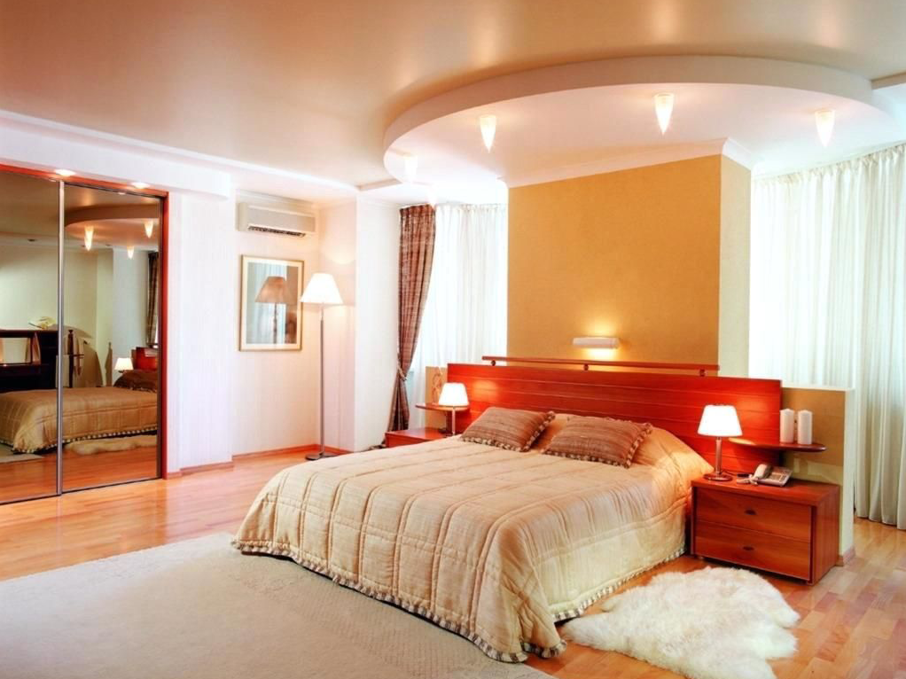 В случай, че таванът има някакви дефекти в спалнята и не искате да губите ценно време, като ги премахнете, можете да използвате френската версия и да инсталирате опънат таван. Ако сте съгласни да плащате много пари за работата и да сте съгласни с факта, че опънатата тъкан ще ви лиши от няколко сантиметра от височината на стаята, можете да разработите дизайн на опънати тавани в спалнята.