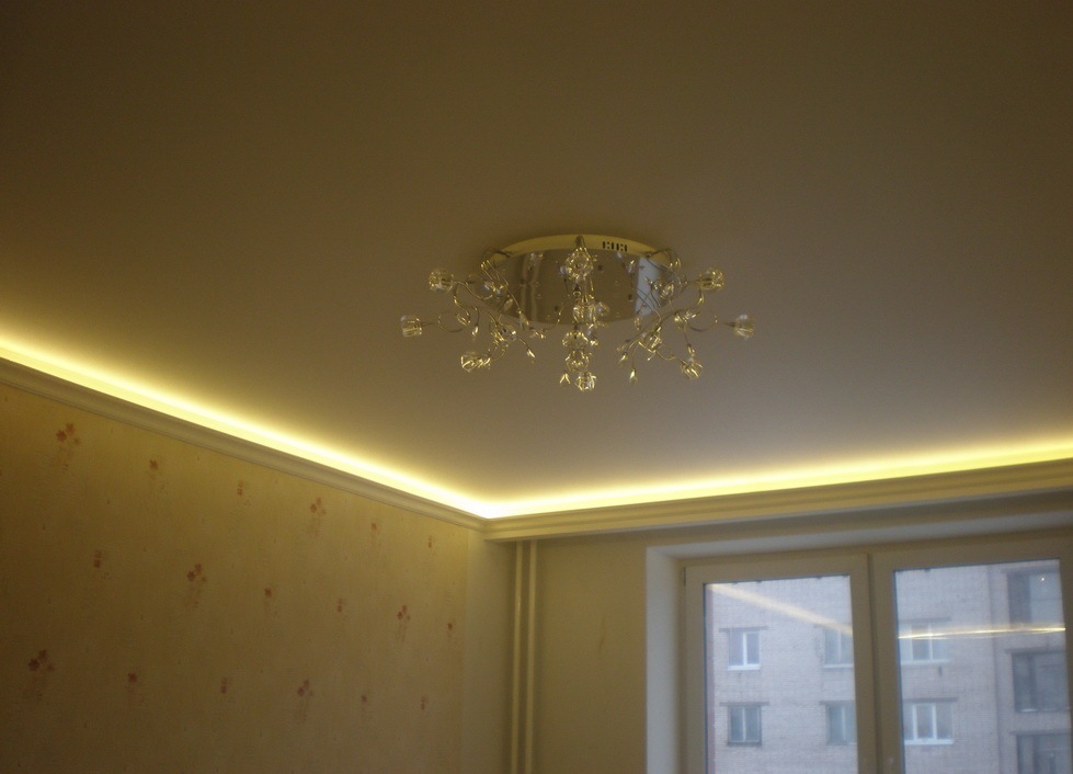 Отделно от това си заслужава да се спомене такава концепция като двустепенна опъна таван с осветление. Двустепенните тавани са станали модерни и задържат позициите си здрави. Сега е трудно да се намери апартамент с пресен ремонт, в който поне някъде не е имало елемент на двустепенния таван. Обикновено горното ниво е напрежение, а долната - от гипсокартон. Между тези две нива много често се изтъкват, създавайки по този начин оригиналния интериор на стаята. Най-често границите в този случай се разделят с LED лента. Естествено, този вид осветление не може да служи като основен източник на светлина в стаята, но това е чудесен начин да покажете въображението си и да превърнете стаята. Поради свойствата на светодиодите, можете да играете с цветовата гама на осветлението, като използвате най-неочакваните опции.