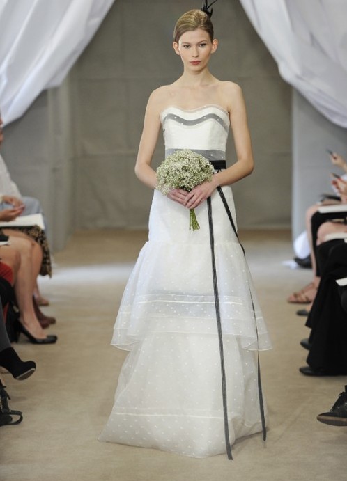 Всички рокли са бели, но има един модел с черни панделки и сиво парцалче на корсет: строг, но в същото време оригинален вариант.