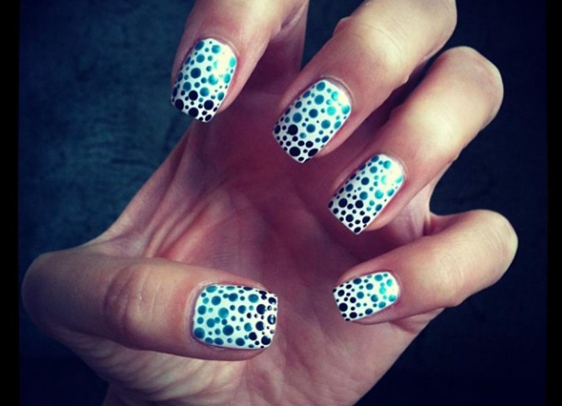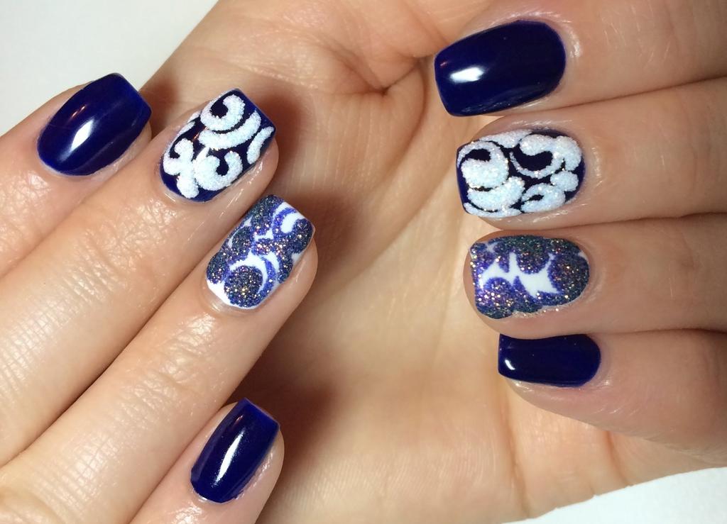 Сини и бели маникюри с рисунки . Най-разнообразните и красиви се считат за дизайн с модели или модели. В този случай основата може да бъде както бял, така и син лак. Популярни модели са флорални абстракции и необичайни къдрици. Стилистите допълват този дизайн с пайети, прах, блясък.