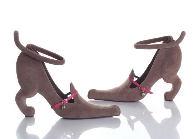 Смешни обувки с висок ток . Не толкова отдавна, колекция от модели, наречена копита, беше пусната за публичен преглед. И всичко би било нищо, ако дизайнерите не използваха истинските възбудени кости на конете, купчината и кожата им. Някои обувки бяха допълнени с пета под формата на пистолет. Друг отличителен аксесоар върху петата бяха обувките - перките. И състезанието се прави от обувки под формата на котка, подготвя се да скочи, със стеснен пръст вместо муцуна.