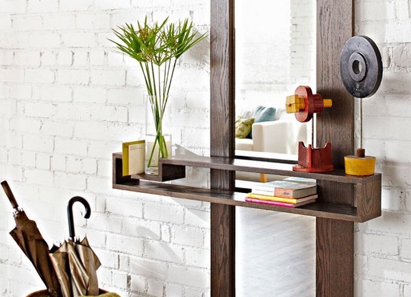 В стената на коридора рафтовете също са много подходящи. На такъв отворен шелф, намиращ се под огледалото, е много удобно да поставяте всякакви дребни неща като ключове, телефони, ръкавици, козметика и т.н.