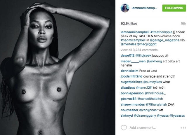 Първоначално Наоми Кембъл позира за фотосесия, поставена в лъскавата гараж, собственост на Дария Жукова, съпругата на Роман Абрамович. Тогава снимката беше поставена в Instagram с hashtag #freethenipple. Вярно е, че във формата, която не е ретуширана, фотографията е съществувала в мрежата за не повече от 20 часа, ползата от феновете на Naomi успя да направи екранни снимки, докато управлението на социалната мрежа не предприеме действия.