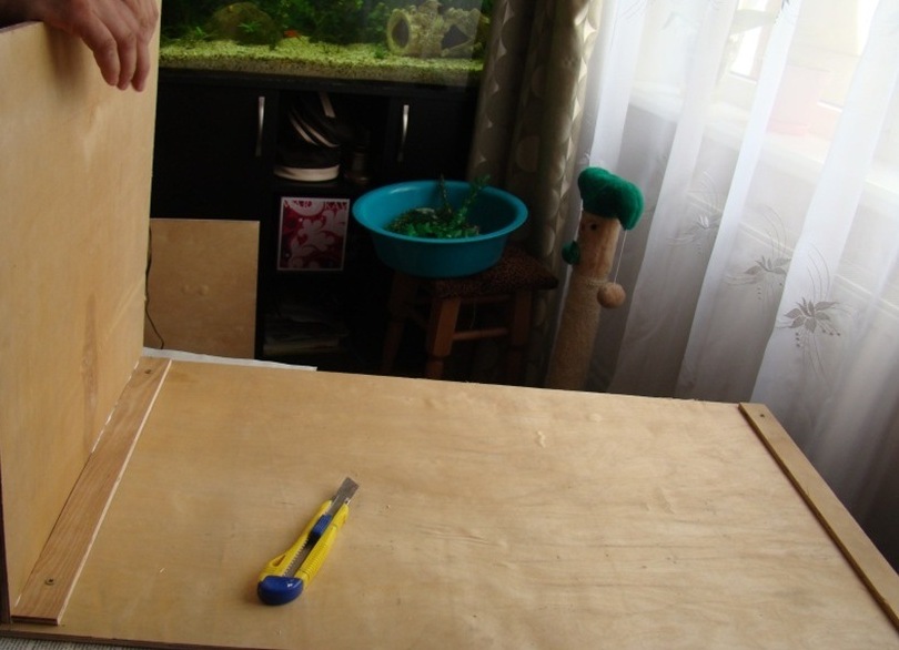 - Не забравяйте, че всички материали трябва да бъдат екологични. Дъното и трите стени ще бъдат изработени от шперплат, предната част - изработена от стъкло. Ние се основава на 87x47 см и течни нокти на водна основа.