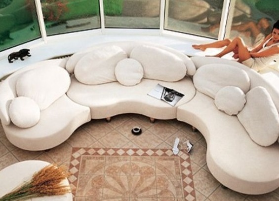 Дивани, направени под прозореца на залива, заемат минимално свободно пространство, заемайки района, на който е трудно да си представим каквито и да е други мебели. В същото време, допълнени с различни бордюри и други елементи, нивото на комфорт и функционалност, които имат, е по-високо от това на другите модели мека мебел.