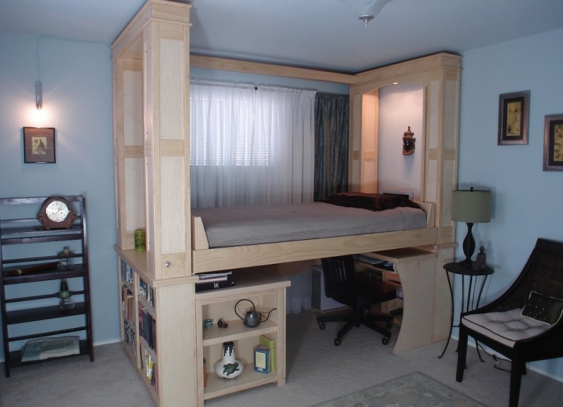 За да оптимизирате допълнително пространството, можете да изберете симбиоза на легло, килер и маса. По този начин стаята през нощта може да бъде спалня, а следобед - едно проучване. Механизмите на трансформация могат да бъдат различни. Първо, той използва вече описаната опция по-горе, когато леглото през нощта напуска кабинета. В този случай масата с помощта на друг механизъм се издига нагоре и в деня, когато падне на мястото на леглото. На второ място, в килера можете да скриете масата, а леглото се спуска от тавана надолу и обратно. Или, трето, с помощта на предварително обмислен механизъм за смяна на леглото и масата на места: през нощта, спуснете леглото и повдигнете масата, а сутринта направете обратното. Във всеки случай, трансформаторът с двойно легло - удобен и малко неусложнен за въплъщение на нещо от живота.