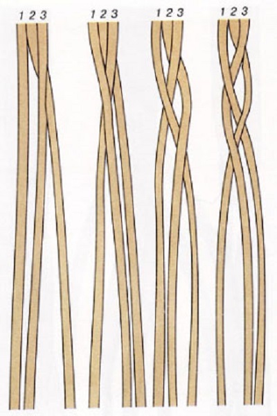 - След това плетената по схемата: най-лявата нишка - под най-дясната, най-дясната - под най-лявата.