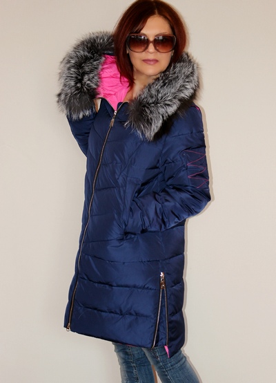 Едно тъмно синьо памучно яке с козина дава на изображението луксозен и елегантен вид. Но с него не трябва да носите такъв общ елемент на гардероба, като хъркане , но трябва да изберете тесен шал.