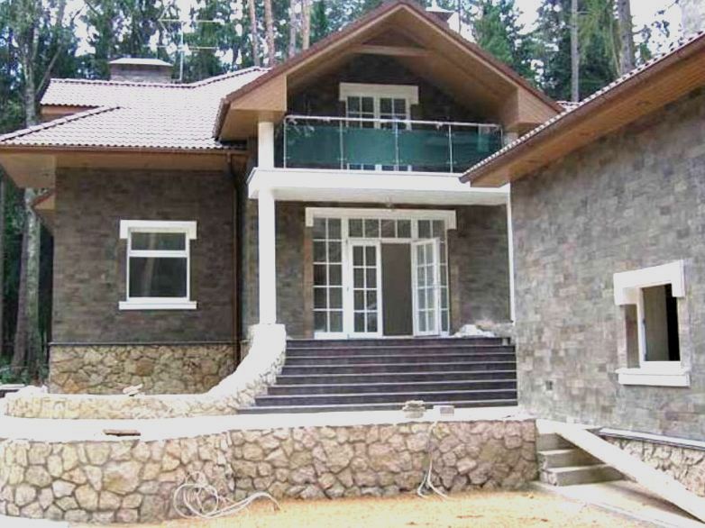 Каменна фасада на вилата. Винаги има собственици, които искат да построят вили в стария стил на камък, напомнящи за малки уютни замъци. Но този материал е достъпен само за богатите граждани. Работата с гранит, шисти или естествен мрамор е толкова трудоемка и скъпа, че дълго време само елитът може да си позволи такива сгради. Сега, каменни фасади за вили са станали по-евтини, поради факта, че плочки и панели, изработени от изкуствен камък, които на външен вид изглежда почти идентични с естествени скали, са се разпространили.