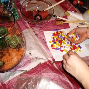 - Време е да започнете да засаждате цветя. С помощта на градински остриета или обикновени лъжици ние правим канали, поставяме растения и поръсваме с пръст. Почвата отгоре може да бъде украсена с разнообразие от декоративни елементи. Много добре в затворени и открити съдове изглежда като мъх, интересни извити клонки, цветни камъчета. Ако има желание, поставени в качеството на фигурки на гноми, малки декоративни фигурки или къщи. Те ще направят състава на цветя пълен външен вид.