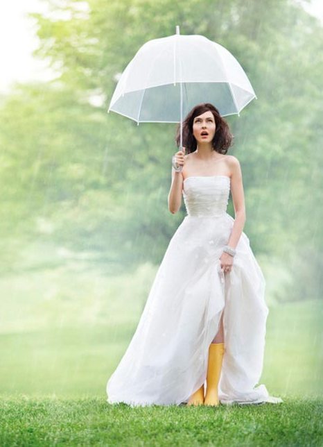 Булката с бял чадър чадър изглежда невероятно женствена и красива. Със сигурност ще имате много идеи за фотосесия с чадър - можете да направите снимка срещу небето, да се преструвате, че се криете от слънцето. И пускането на гумени ботуши и вземането на стилен чадър, можете да направите някои страхотни снимки.