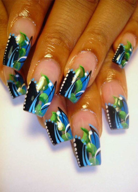 Когато създавате дизайнерски маникюр, обърнете специално внимание на точността на изпълнението и комбинацията от цветовете на основата и шарката. Не забравяйте, че един или два слоя защитно покритие трябва да се поставят върху шаблона (това може да бъде специален връх или обикновен прозрачен лак за нокти).