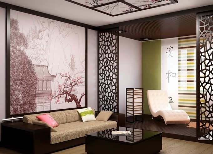 Апартаментът в японски стил е декориран в топли, пастелни цветове, по-ярки оттенъци се използват минимално, само за контраст. Мебелите в този апартамент са направени само от естествени материали, с използването на бамбук , на пода са разтеглени рогозки от рогозки, сламки. Основният принцип на декора е стените в светли тонове, мебелите са тъмни. На стените може да се постави украшение, основният мотив на който ще бъде сакура или кран.