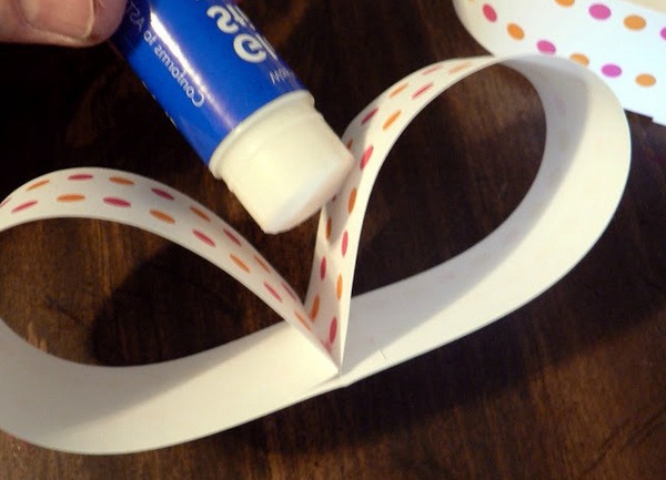 Когато сърцата са готови, можете да продължите да събирате самия гирлянд. За да направите това, ви трябват малки пръстени от една и съща хартия. Ние ги нарязваме и прикрепяме сърцата си един към друг с тези пръстени.