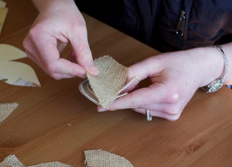 - Нанесете върху лист от лепило от картон и лепете детайла от уплътнението отгоре. Внимателно отрежете излишните участъци от тъканта и изпъкналите нишки.